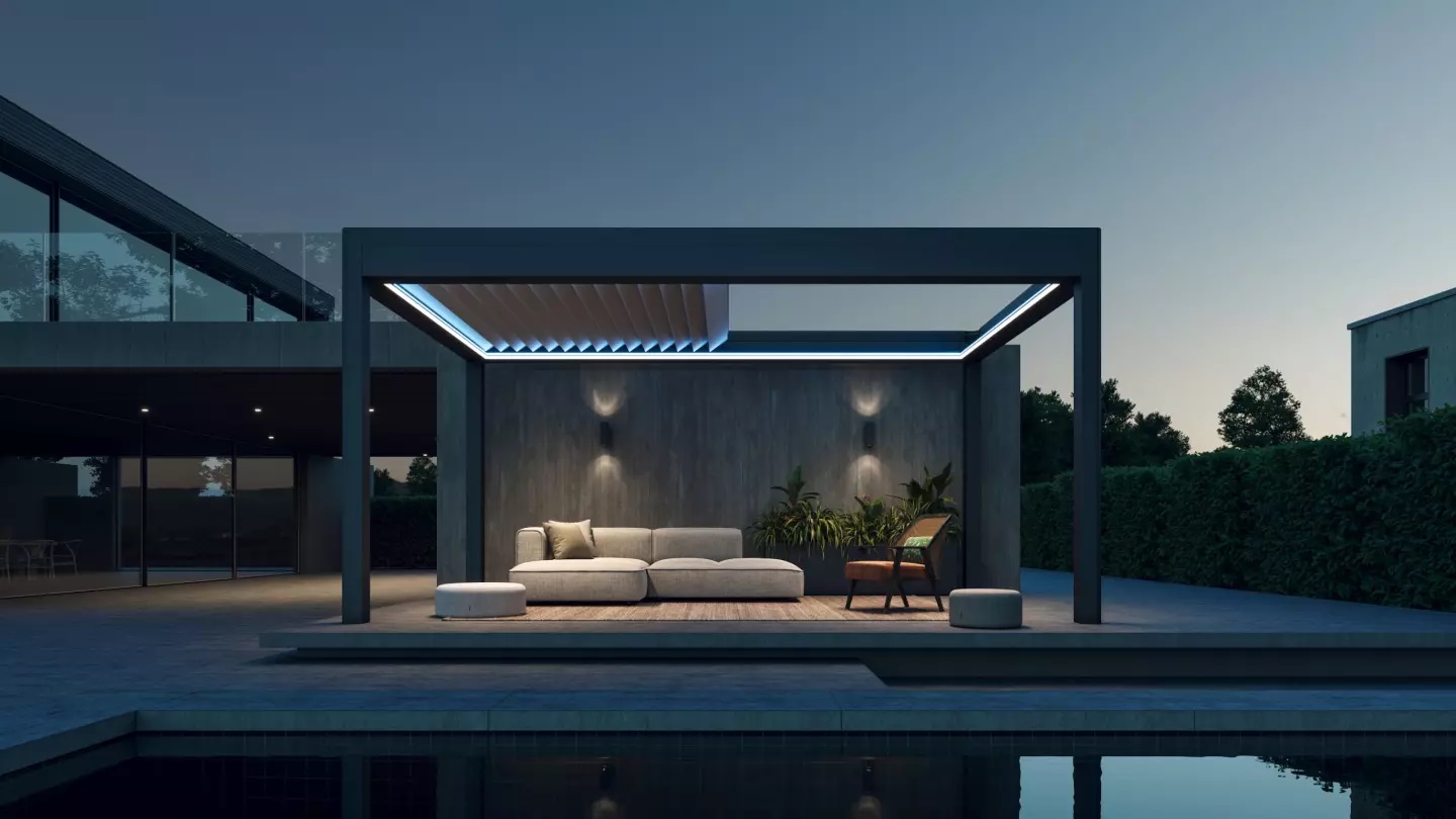 Albert Genau Bioklimatik Pergola çift yönlü aydınlatma özelliğiyle donatılmıştır. Ambiyans aydınlatma seçeneği, mekânın genel aydınlatmasının yanı sıra çoklu modlara sahip, ayarlanabilir renk spektrumuyla her türlü atmosfere uyum sağlar. Pergolanın aydınlatma fonksiyonu, sonradan eklenme özelliğiyle ambiyans aydınlatma, ortam aydınlatma ve tamamen aydınlatmasız şekillerde uygulanabilir. Bu seçeneklerin her birinde, estetikten ödün verilmeden, kullanıcıya en uygun aydınlatma deneyimi sunulur.