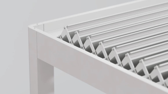 Bioklimatik pergolanın panelleri, makas sistemi ile birbirine bağlanarak senkronize bir şekilde açılıp kapanma hareketi gerçekleştirir ve her türlü ortamda güvenilir performans sunar. Bu makaslar, hareket sırasında panellerin konumunu ve hızını kontrol altında tutarak sistemin bütünlüğünü her an korur.